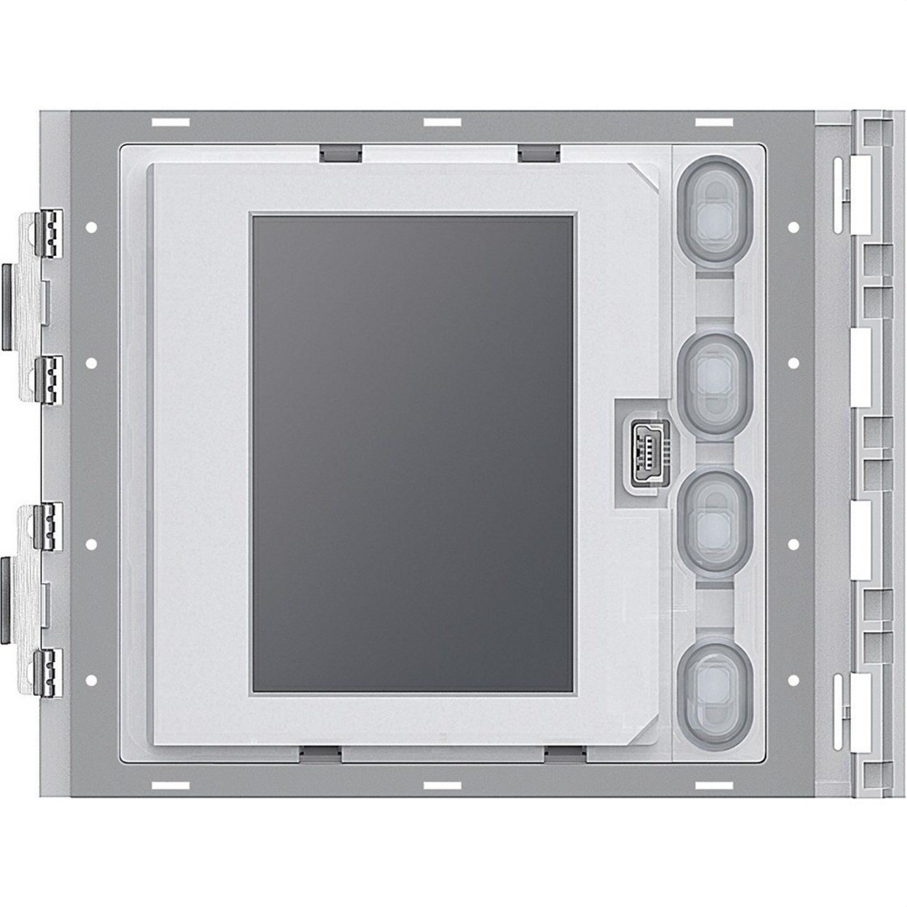 Módulo con display gráfico que puede utilizarse con el módulo fónico 351100 o módulos audio vídeo 351200 - 351300 (conexión por medio de cable múltiple incluido). Puede funcionar en dos modos: llamada desde la agenda o llamada digital. La llamada desde la agenda permite enviar la llamada desplazando en el display los nombres asociados a los residentes. Es posible memorizar hasta 4000 usuarios residentes. En combinación con el módulo teclado 353000 es posible efectuar también la llamada directa al apartamento simplemente marcando el número correspondiente al residente. La llamada digital, se efectúa siempre en combinación con el módulo teclado 353000 ingresando la clave numérica. Se aconseja utilizar con la botonera uno o varios módulos tarjeteros 352200 para visualizar la correspondencia entre clave numérica y los nombres de usuario. Es posible programar los nombres en la agenda en dos modos diferentes: introducción manual mediante los pulsadores del módulo display o introducción mediante PC con software TiSferaDesign descargando el archivo en el módulo display (ACONSEJADO). La ausencia de alimentación del sistema NO produce la pérdida de los datos memorizados. Integrable con frontal de acabado.
