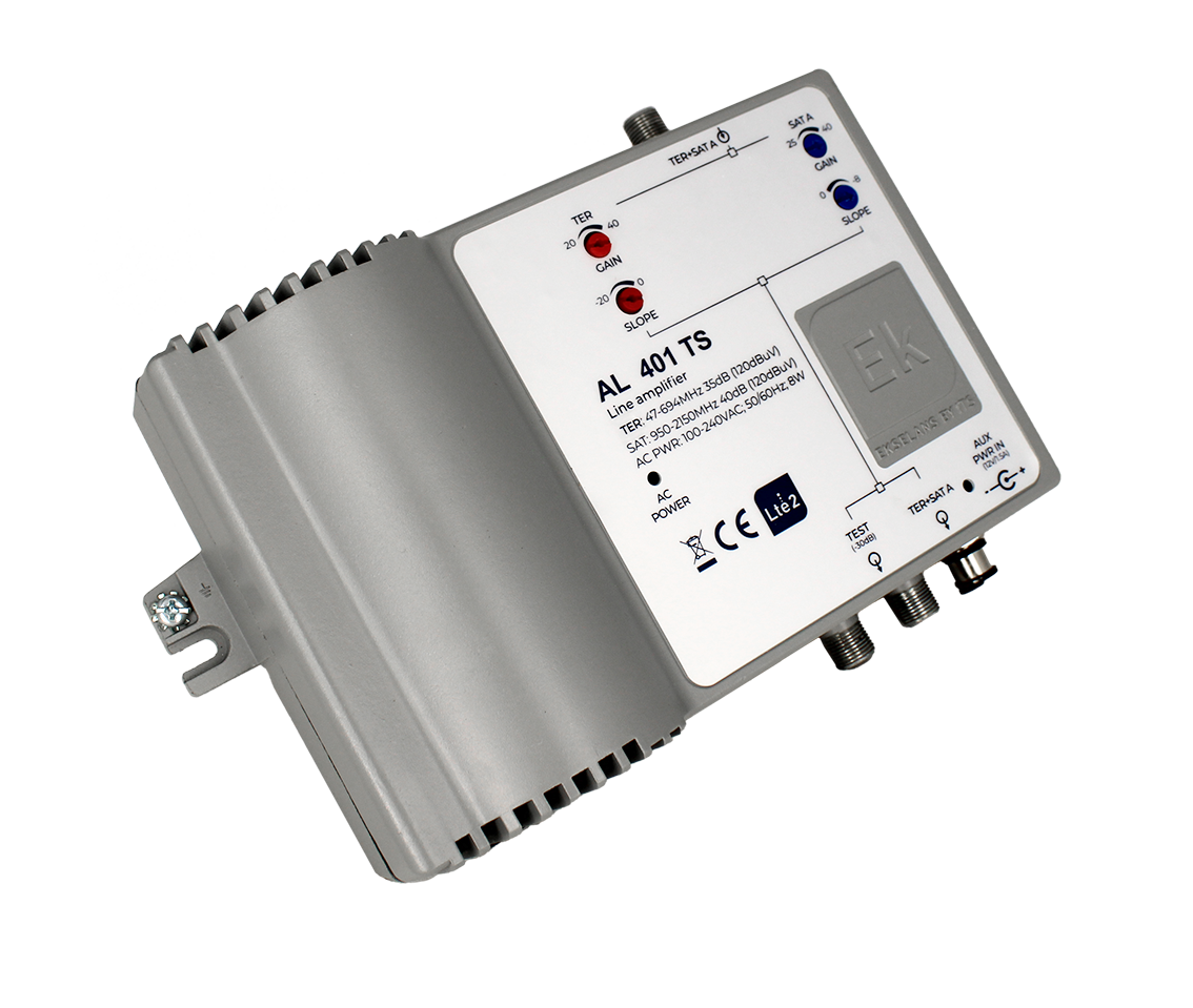 EKSELANS BY ITS – Amplificador de línea TER + SAT. 1 entradas: TER + SAT (47-694 / 950-2150 MHz). G: 40 dB (TER) / 40 dB (SAT)