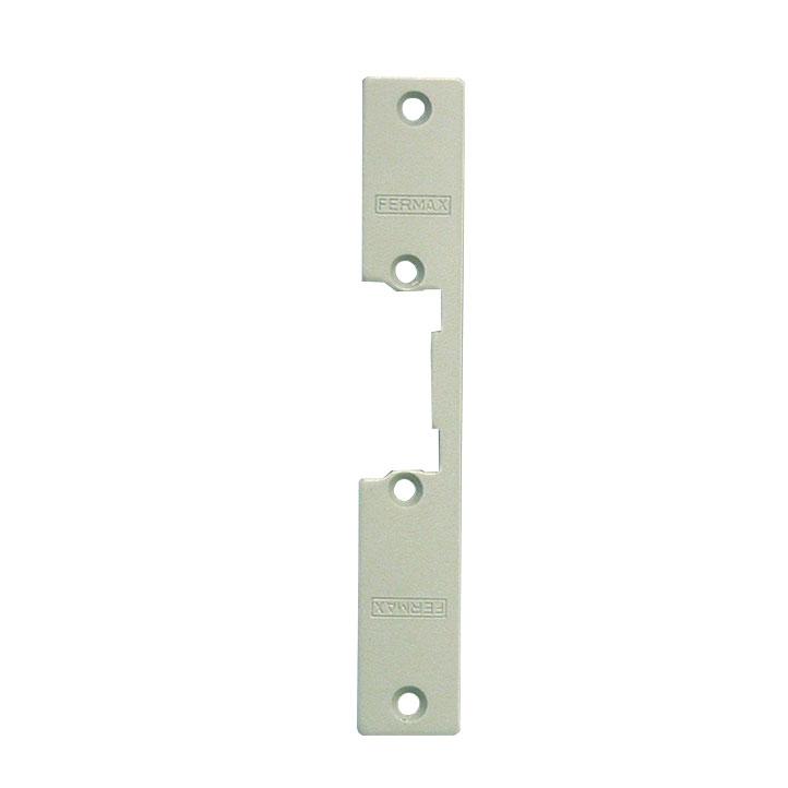 Armadura de empotrar Tipo S. Para puertas de paso.Embellecedor metálico gris tipo S que unido a un mecanismo eléctrico forma un abrepuertas de empotrar. Dimensiones: 25(H)x160(V) mm.