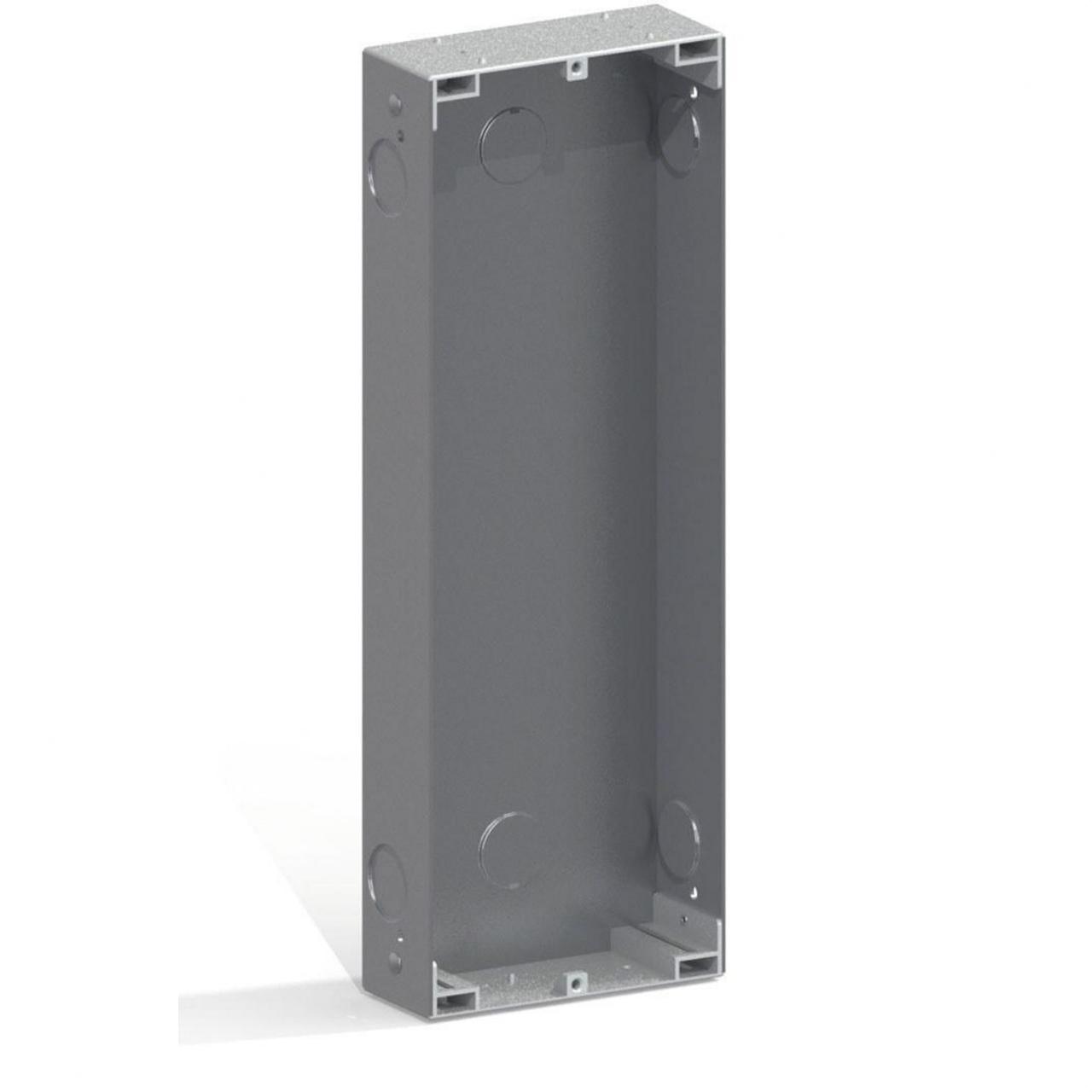 Caja empotrar CITY S7. Para realizar la instalación de una placa es necesario colocar una caja en la pared o muro donde posteriormente fijaremos la placa. Las cajas de empotrar están fabricadas en aluminio y zamak. Disponen de unas bisagras abatibles en cualquier sentido, que permiten sujetar la placa mientras se realiza el cableado. Tienen unas marcas circulares hendidas en el fondo de la caja, que se agujerean con un ligero golpe o presión, permitiendo así el paso de los cables. En el caso que se combinen varias placas, siempre de la misma serie, es necesario la utilización de un juego de separadores para un perfecto acoplamiento. Se requiere un juego por cada placa adicional que se instala entre las cajas de empotrar. Disponibles en todas las series. Seleccionar la caja de la serie necesaria, según el caso.
