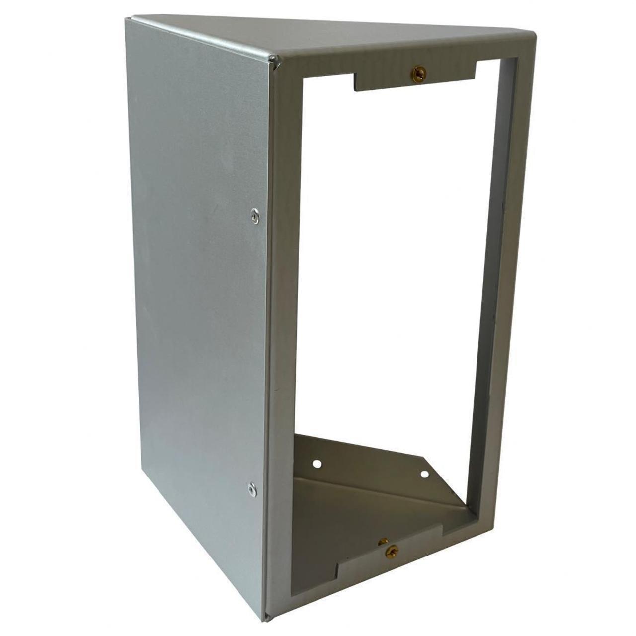 Complemento angular-doble CANCELA simple. Necesario cuando la placa debe instalarse en un punto de difícil accesibilidad, por ejemplo, detrás de una verja. También es útil para poder enfocar mejor la cámara, en lugares en los que la placa está instalada de forma que la persona que ha llamado queda fuera del campo de visión de la misma. Están fabricadas en aluminio anodizado de 2mm de espesor. Como es posible combinar dos o más placas, siempre que sean de la misma serie, existen 9 series de complementos angulares para placas simples, dobles o triples, seleccionar el complemento angular de la serie necesario, según el caso. Necesario cuando la placa debe instalarse en un punto de difícil accesibilidad y que dificulta la comunicación/visión óptima, por ejemplo, detrás de una verja. Se debe seleccionar el complemento angular correspondiente a la serie de la placa/s instalada/s.