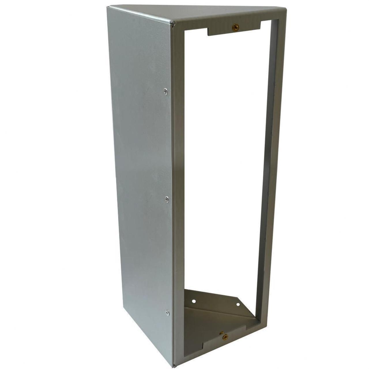 Necesario cuando la placa debe instalarse en un punto de difícil accesibilidad, por ejemplo, detrás de una verja. También es útil para poder enfocar mejor la cámara, en lugares en los que la placa está instalada de forma que la persona que ha llamado queda fuera del campo de visión de la misma. Están fabricadas en aluminio anodizado de 2mm de espesor. Como es posible combinar dos o más placas, siempre que sean de la misma serie, existen 9 series de complementos angulares para placas simples, dobles o triples, seleccionar el complemento angular de la serie necesario, según el caso. Versiones de Complemento Angular para 1, 2 ó 3 placas: SIMPLE: 1 Placa. DOBLE: 2 Placas. TRIPLE: 3 Placas.
