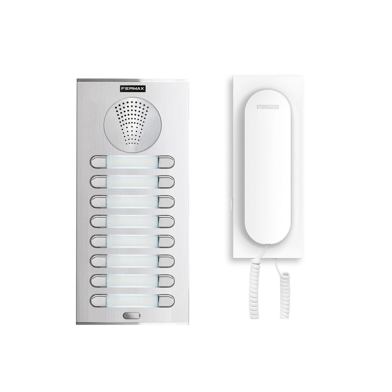 Kit PORTERO 16 viviendas. Instalación: 4+N (1 hilo por vivienda). Los kits de portero para edificios incluyen todo el material necesario para una instalación completa y un funcionamiento inmediato: placa de calle y caja de empotrar, alimentador DIN 12Vac/1A (ref.4802) y 16 teléfonos VEO.