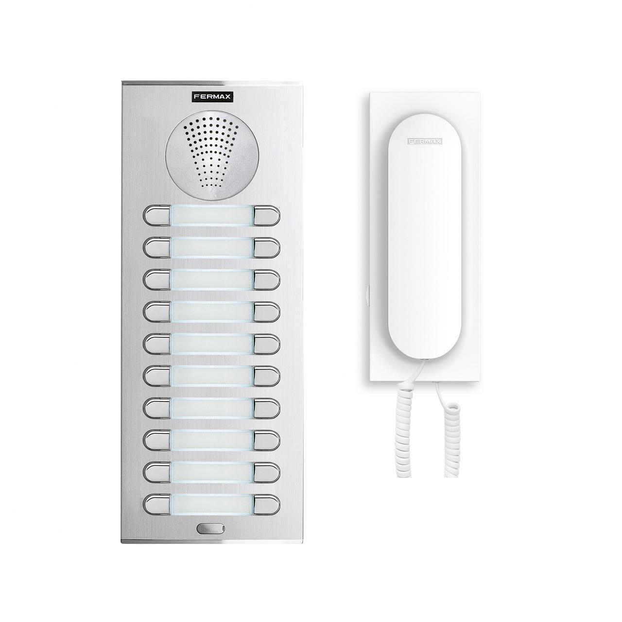 Kit PORTERO 20 viviendas. Instalación: 4+N (1 hilo por vivienda). Los kits de portero para edificios incluyen todo el material necesario para una instalación completa y un funcionamiento inmediato: placa de calle y caja de empotrar, alimentador DIN 12Vac/1A (ref.4802) y 20 teléfonos VEO.
