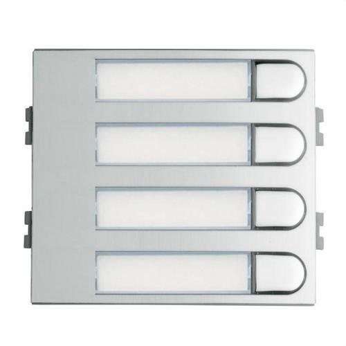 Pulsadores de llamada integrados en módulos de pulsadores para la nueva placa SKYLINE, para su ubicación en el marco de la placa. Pulsadores de Llamada de zamak inyectado con acabado cromado, en línea con el perfil curvo de la placa. Estanco para exteriores. Dotados de contactos especiales con baño de oro que les proporcionan mayor durabilidad. La pulsación del botón de llamada es confirmada mediante un testigo acústico que emite el amplificador. Los pulsadores incluyen un tarjetero de policarbonato (acceso frontal), para alojar una etiqueta con el nombre del propietario de la vivienda y el número de puerta. Iluminación integrada que permite visualizar los tarjeteros, aún en la más completa oscuridad. Son metálicos y tienen una forma redondeada en línea con el perfil curvo de la placa. El montaje de los módulos de pulsadores es extremadamente sencillo. Una vez elegida la combinación de módulos según el número de viviendas, procedemos a encajarlos en el marco de la placa. El sistema de anclaje consiste en una leve presión desde el interior hacia el exterior. Finalmente, los distintos módulos de pulsadores se unen mediante unos conectores fácilmente enchufables que se incluyen. Módulos disponibles de pulsadores simples y dobles. La Nueva placa SKYLINE de portero electrónico y videoportero es una placa robusta y elegante, que destaca por su durabilidad y belleza, resistencia y fiabilidad.