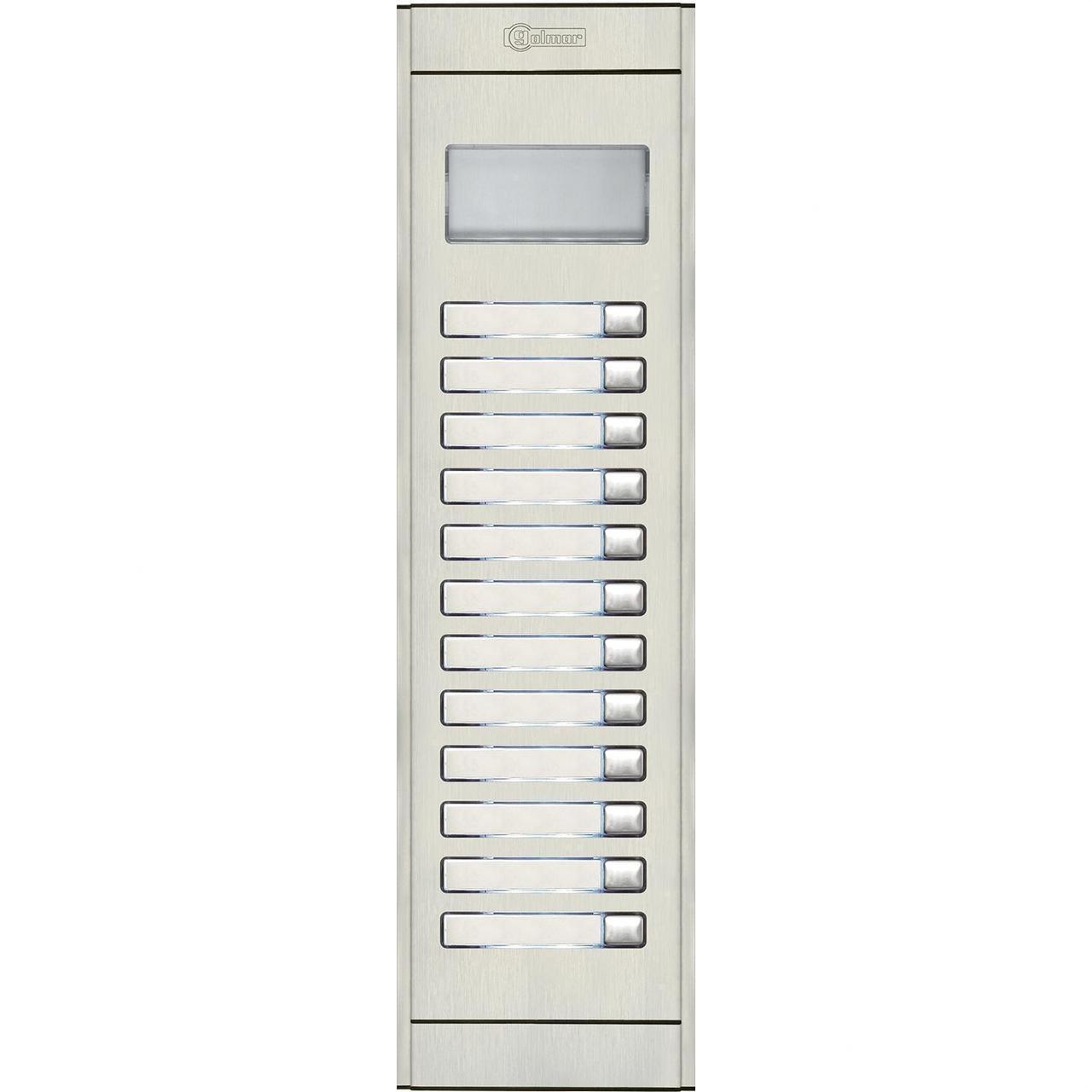 Solo para reposición de placas Serie 60 largas. 12 pulsadores de llamada. Visor informativo. Frontal de aluminio anodizado de 1,8mm. de espesor. Incluye soporte metálico para la instalación de los módulos electrónicos. Módulos electrónicos no incluidos. Dimensiones externas: 113(An) x 405(Al) mm