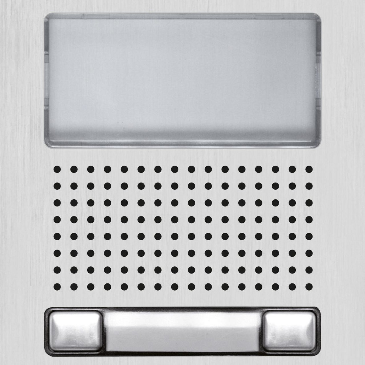 Módulo audio/video 2 pulsadores N1220/AL. Fabricado en aluminio anodizado. Rejilla para difusión de sonido. Ventana protectora para telecámara o panel informativo para audio. Posibilidad de montaje horizontal y vertical. Completar la placa con el kit de montaje o ensamblaje. N° máximo de módulos en vertical 3