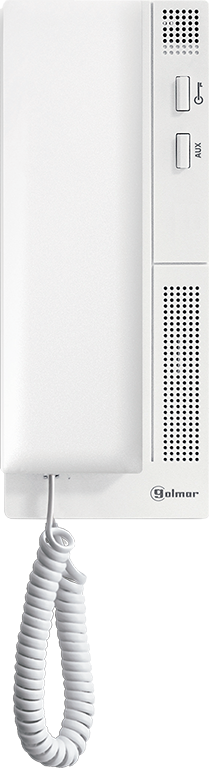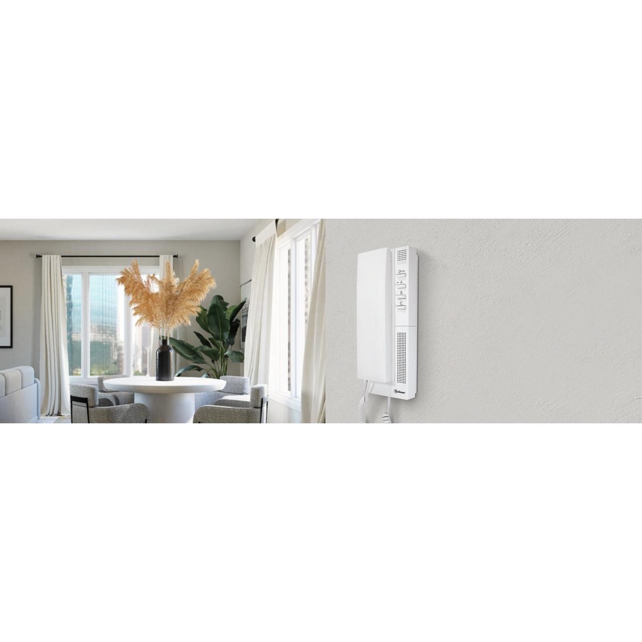 Instalación analógica 4+n. Sustituye al teléfono T-712VD. Llamada electrónica. Carcasa fabricada en plástico ABS color blanco RAL9003. Cordón telefónico del auricular extraíble mediante conectores. Colocación mural con múltiples puntos de fijación. Dimensiones: 85(An) x 221(Al) x 56(P) mm. Pulsador de apertura de puerta. Pulsador adicional libre de contacto. Cápsula eléctrica de alta sensibilidad. El número máximo de unidades dentro de una misma vivienda es tres.